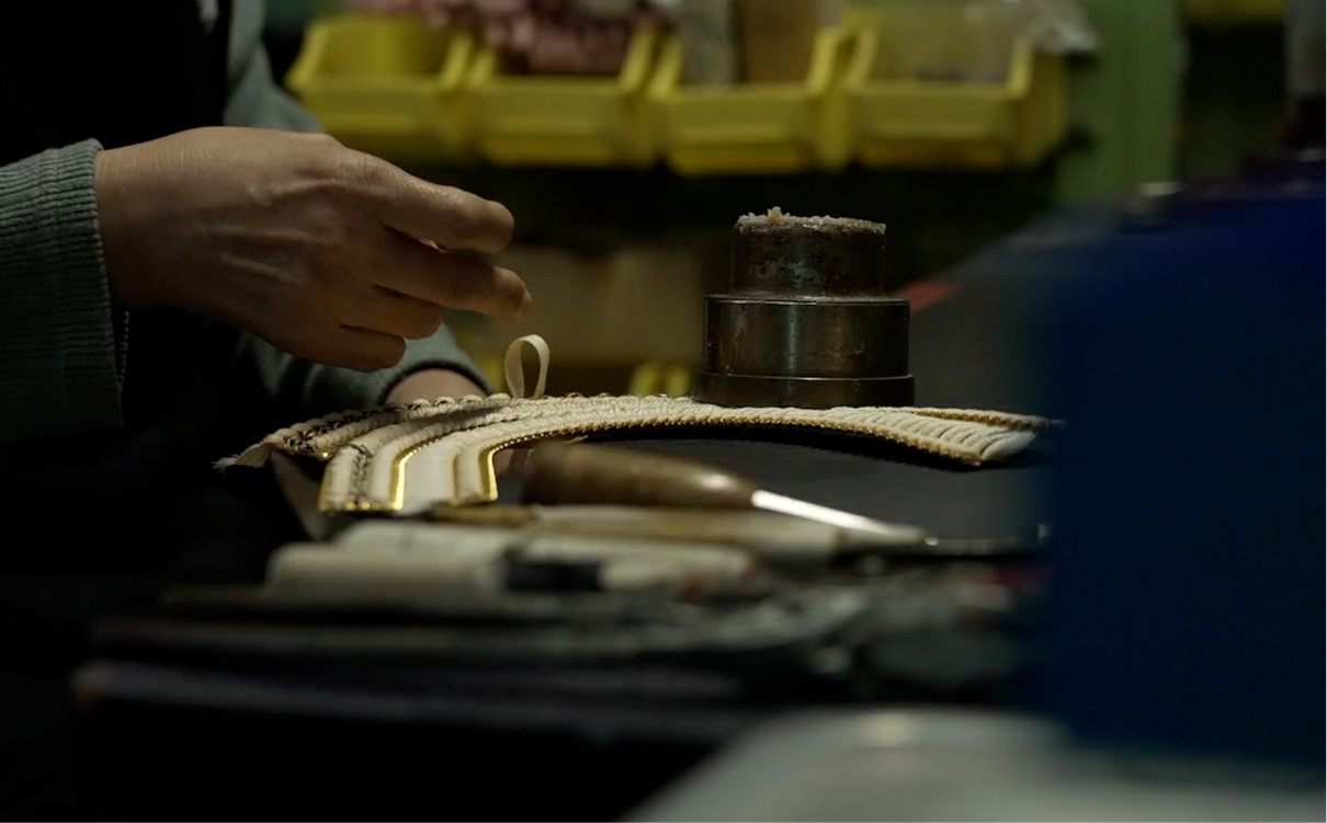 鉄製部品をつなぐ糸おどしや、兜・鎧を豪華に飾る編み込みにも技術が高い職人の技で一つひとつていねいに作り込まれています。